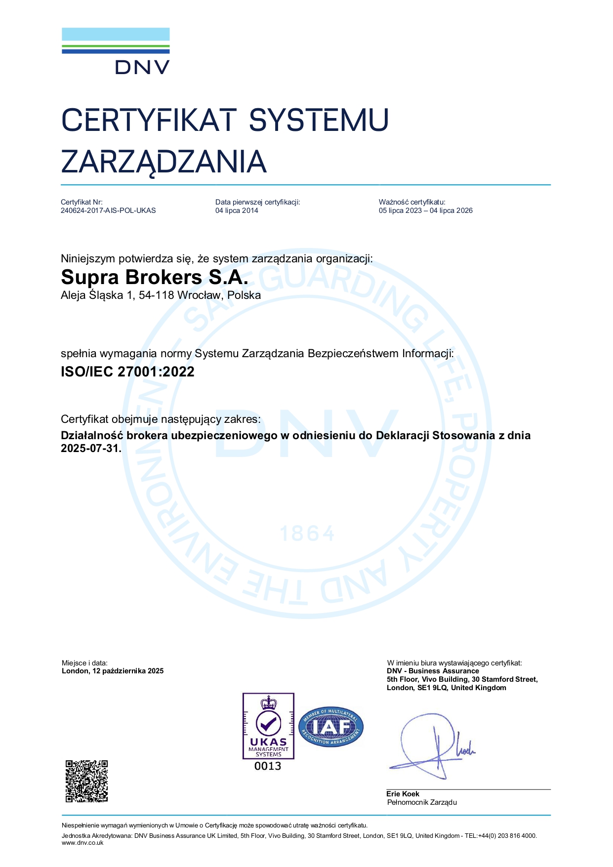 SUPRA BROKERS S.A. informuje, że jest brokerem ubezpieczeniowym.