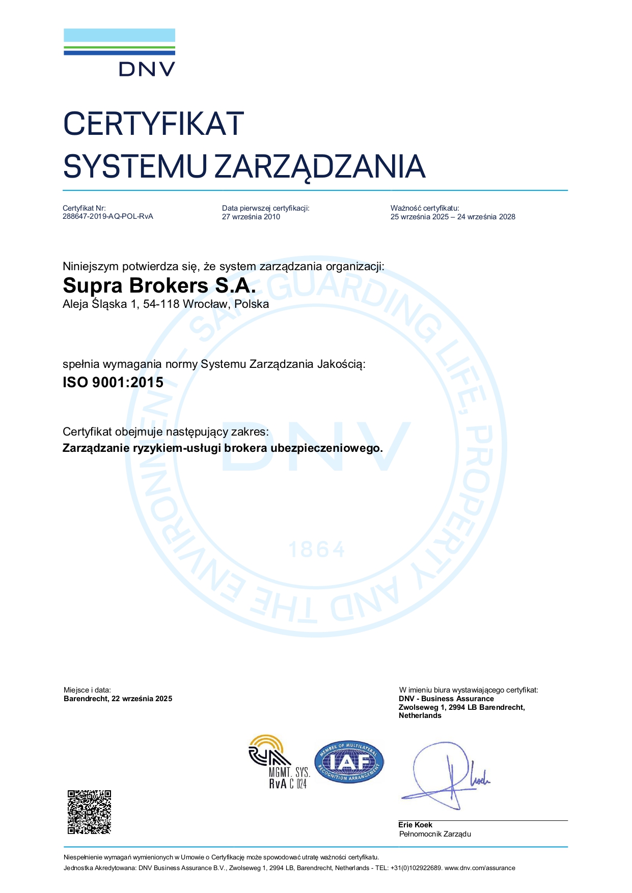 Utrzymujemy międzynarodowy standard systemu zarządzania jakością zgodny z normą ISO 9001 i jako jedna z pierwszych firm brokerskich na rynku pracujemy również w oparciu o standard zarządzania bezpieczeństwem informacji zgodny z normą ISO 27001. Pierwsza certyfikacja zgodności z normą 9001 odbyła się już w 2004 roku, a z normą 27001 w 2014 roku.